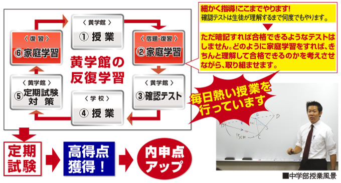 中学生の学習に対するモチベーションが上がる時期は、学校の定期試験前でしょう。黄学館ではこの時期を利用して、できる限り学校別試験対策を行い、各学校の出題傾向に合わせた対策を行って、学校のテストでの上位獲得を目指します。普段授業時間数の少ない国語・理科・社会は、土日の無料補習での演習でしっかり対策していきます。また、対策授業では、出題内容を「当てる」のではなく、学校の教科書やノート、ワークの学習の重要性を意識させるなど、正しい勉強方法を指導していきます。