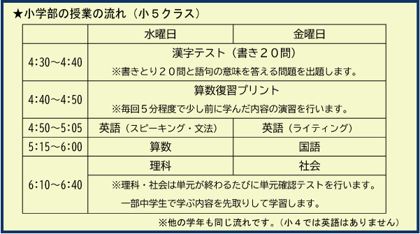 小学生のクラスでは、中学校で上位の成績を獲得する上で重要である学習習慣をお子様に身につけることが目標です。きちんとした学習習慣を身につけることで、中学校での学習課題(提出物)や、定期試験への取り組みをしっかりと行えるようになると考えております。また、勉強において何よりも大切な、分かったときの楽しさ・達成感、自ら「何故、どうして」と思えるような好奇心を養成し、将来のトップ高合格を目指していきます。